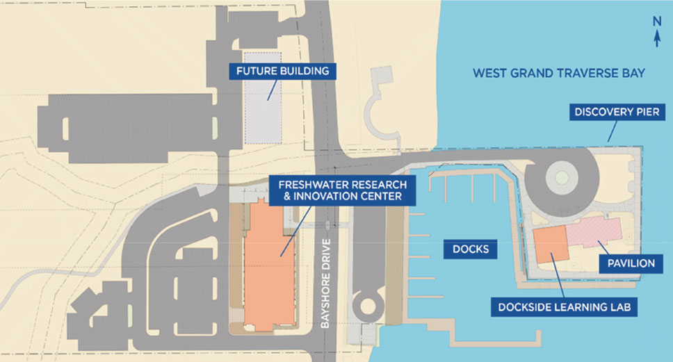 The Freshwater Research and Innovation Center is a 40,000-square-foot technology facility dedicated to providing space for education, research, innovation, incubation, and commercialization in freshwater technology on Discovery Pier’s campus in Traverse City, Michigan.